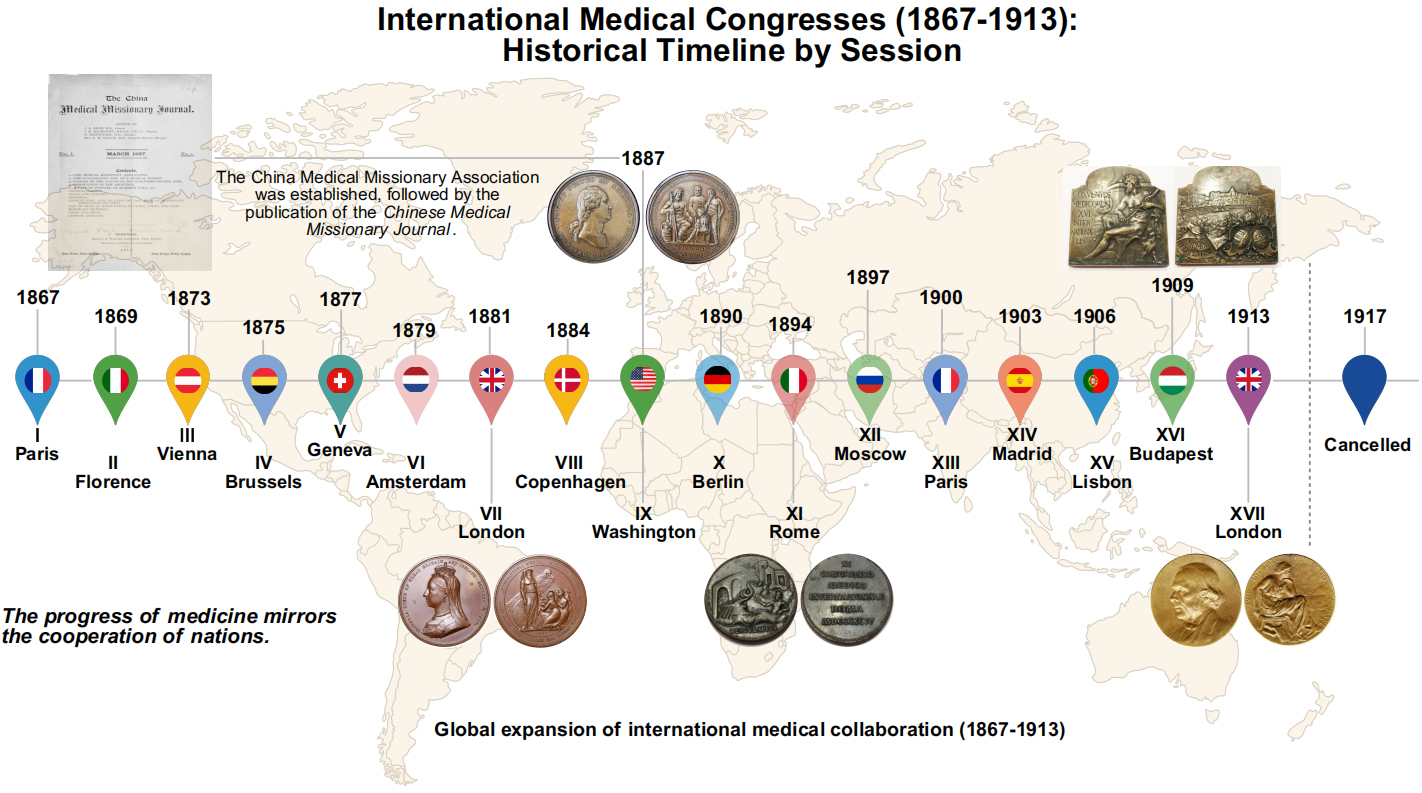 Figure 1.Chronological atlas of International Medical Congresses, 1867-1913, illustrating the global diffusion of medicine through serial gatherings.